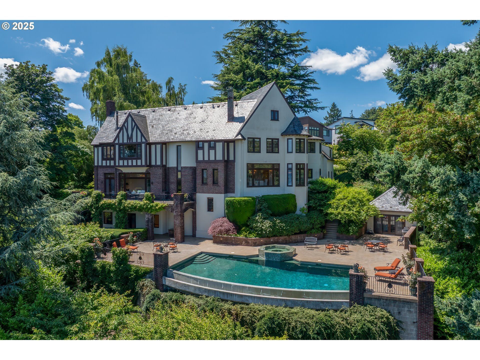 Perched on a bluff in the hills of Southwest Portland, this exceptional 1928 Tudor Revival commands sweeping views of Mt. Hood and the Willamette River. Inside, the home strikes an artful balance between modern comfort and historic authenticity. Rich red oak flooring pairs beautifully with original millwork, custom ironwork, and period brass fixtures. Graceful Tudor archways and coved ceilings evoke Old World craftsmanship alongside leaded glass casement windows with gum wood trim, charming window seats, and a dramatic curved staircase with a hand-forged iron railing. Whether framed by the oversized picture window or enjoyed from the attached balcony, the great room offers stunning river and mountain views, complemented by an elegant fireplace with a hammered copper hood. These views continue in the formal dining room, providing the perfect backdrop for memorable meals. The kitchen marries period charm with modern functionality through rich gum wood cabinetry, granite countertops, multiple sinks, high-end appliances, and a window-lined breakfast nook. The upper level hosts three bedrooms plus the primary suite - a sophisticated retreat with Willamette and Mt. Hood views, a fireplace, and a luxurious bath with a deep soaking tub and custom mosaic tilework. The lower level offers a family room with a floor-to-ceiling brick fireplace, terrace access, and abundant storage. Capitalizing on an unmatched location, an expansive east-facing terrace delivers panoramic views over a heated infinity pool and hot tub, while multiple gathering areas and a pool house with full kitchen allow for effortless entertaining. An adjacent 0.15-acre buildable lot - offered separately - offers future expansion possibilities. Located steps from scenic Terwilliger Parkway and a short walk to the Chart House, the home is bordered to the north by Marquam Nature Park and its 200 undeveloped acres and miles of trails, with the shops and restaurants of South Portland and downtown just minutes away. [Home Energy Score = 1. HES Report at https://rpt.greenbuildingregistry.com/hes/OR10214602]