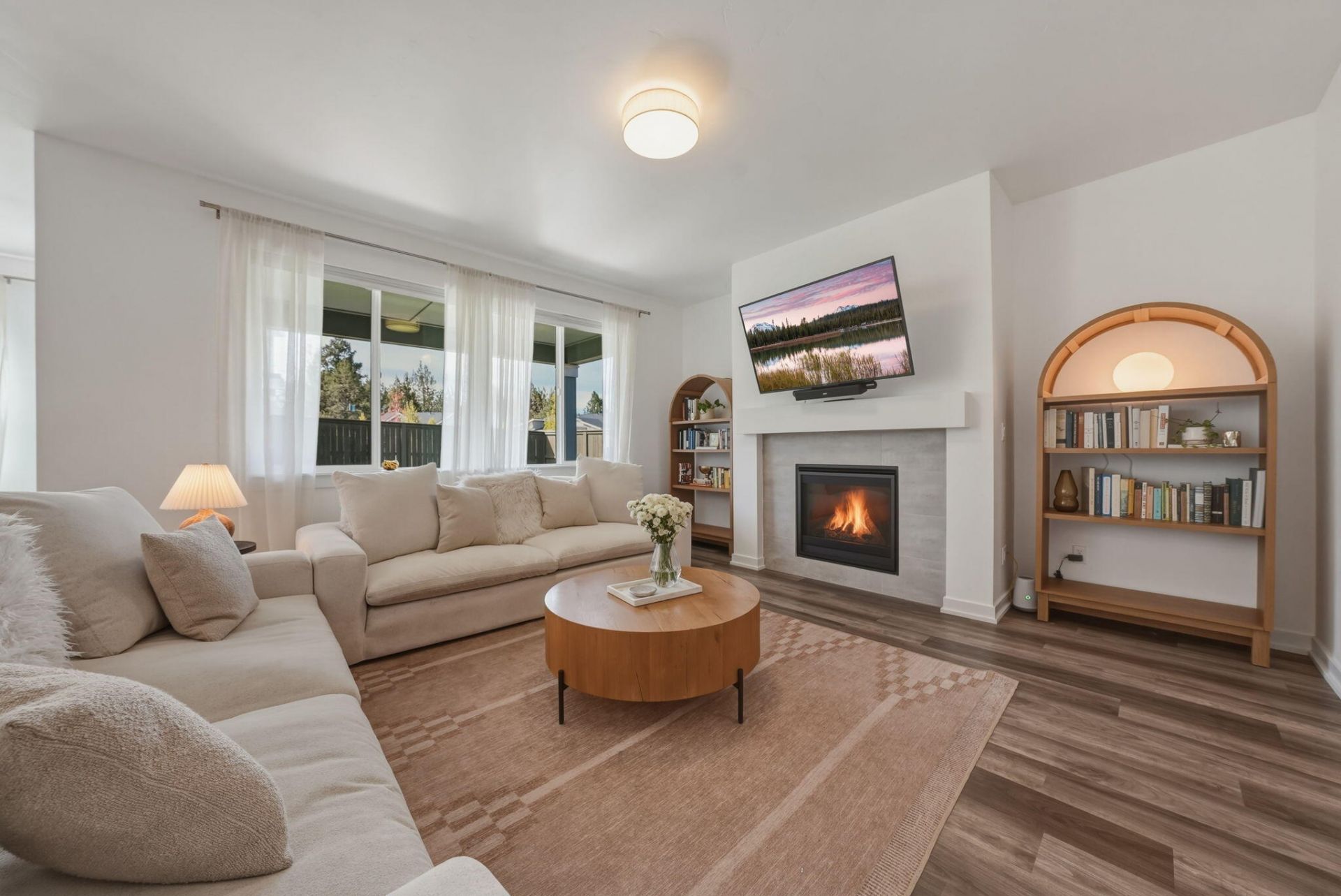 This impeccably maintained SE Bend home feels brand new and lives large with an open-concept design. The contemporary interior features fresh interior paint and custom designer light fixtures, setting it apart from the rest. The chefs kitchen includes an upgraded refrigerator, quartz counters, and a large island, flowing perfectly into the bright living area and fireplace. Upstairs, the oversized bonus space offers mountain views and is a versatile flex space perfect for a playroom, office or workout room. Enjoy one of the largest landscaped backyards in the neighborhood with a shaded patio. The location is unbeatable: minutes from Downtown Bend, the Old Mill District, Larkspur Community Center, the new library, local parks and local coffee shops/dining. Experience low-maintenance living with the neighborhood handling front yard landscaping and street snow removal. Easy access to schools, parks, and the hospital. Your turn-key Bend lifestyle awaits!