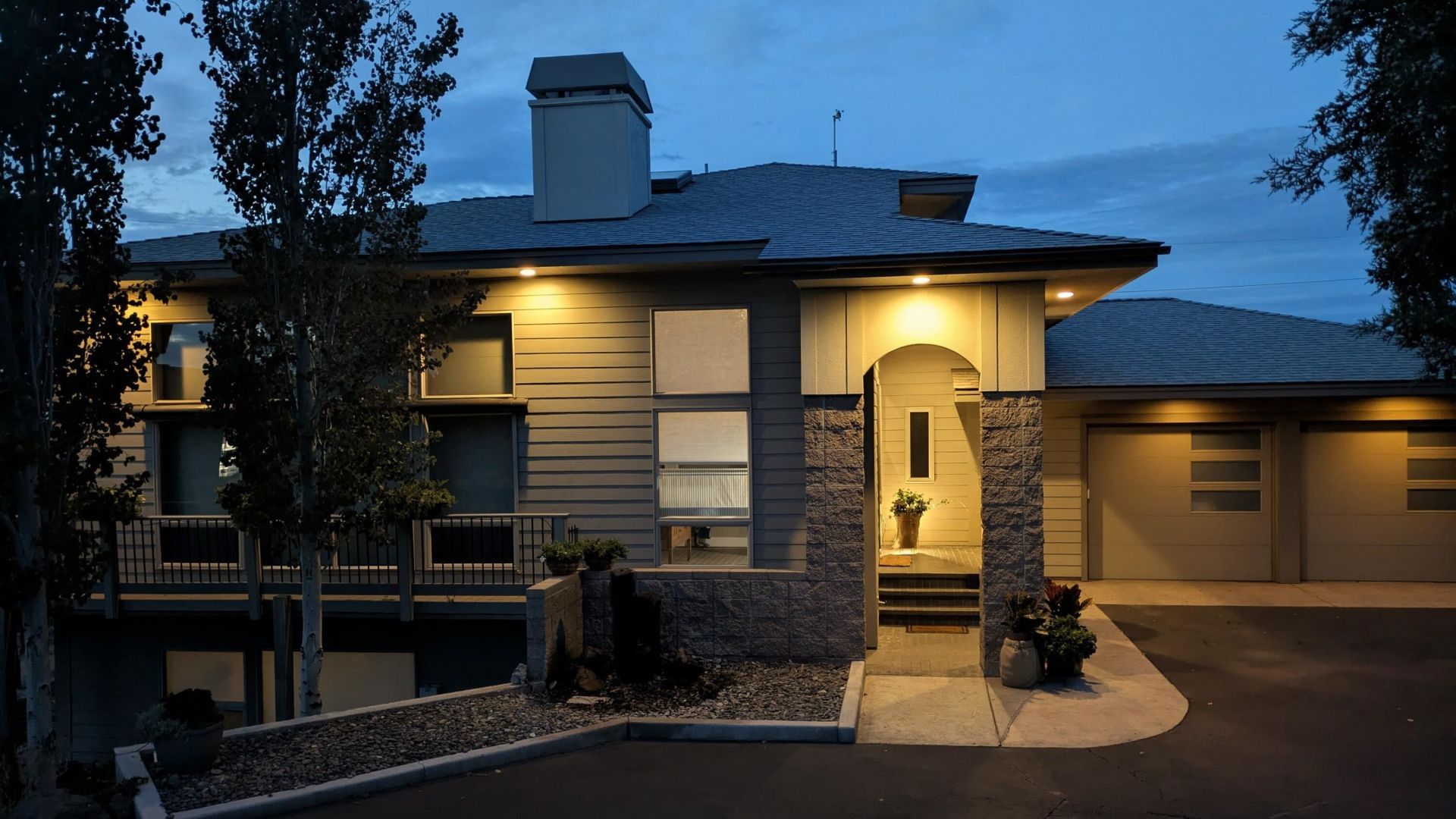Located in Eagle Crest, harmonizing with the high desert, using Southwest, Mediterranean, and Scandinavian Hygge concepts. Super-insulated, energy-efficient, with passive-solar features and fire-resistant block walls providing all-season comfort. 3 bedrooms/en suites on separate levels with sought after expansive mountain views from windows, balcony, deck, and patio. Light-filled great room, stained concrete floors, artisan tile, high-end finishes and wood-burning stove greet you as you enter. Main floor ensuite offers stair-free, independent living; upper level ensuite offers solitude and mountain views; coffee on the balcony, late night star gazing, or a read in the nook. Multi-purpose, lower-level ensuite (currently art studio), has full bath, separate living area, private entrance and patio. Extras include covered, wrap around deck, 854 sq ft garage, 622 sq ft finished storage, hot tub, a basalt water feature and natural landscaping.